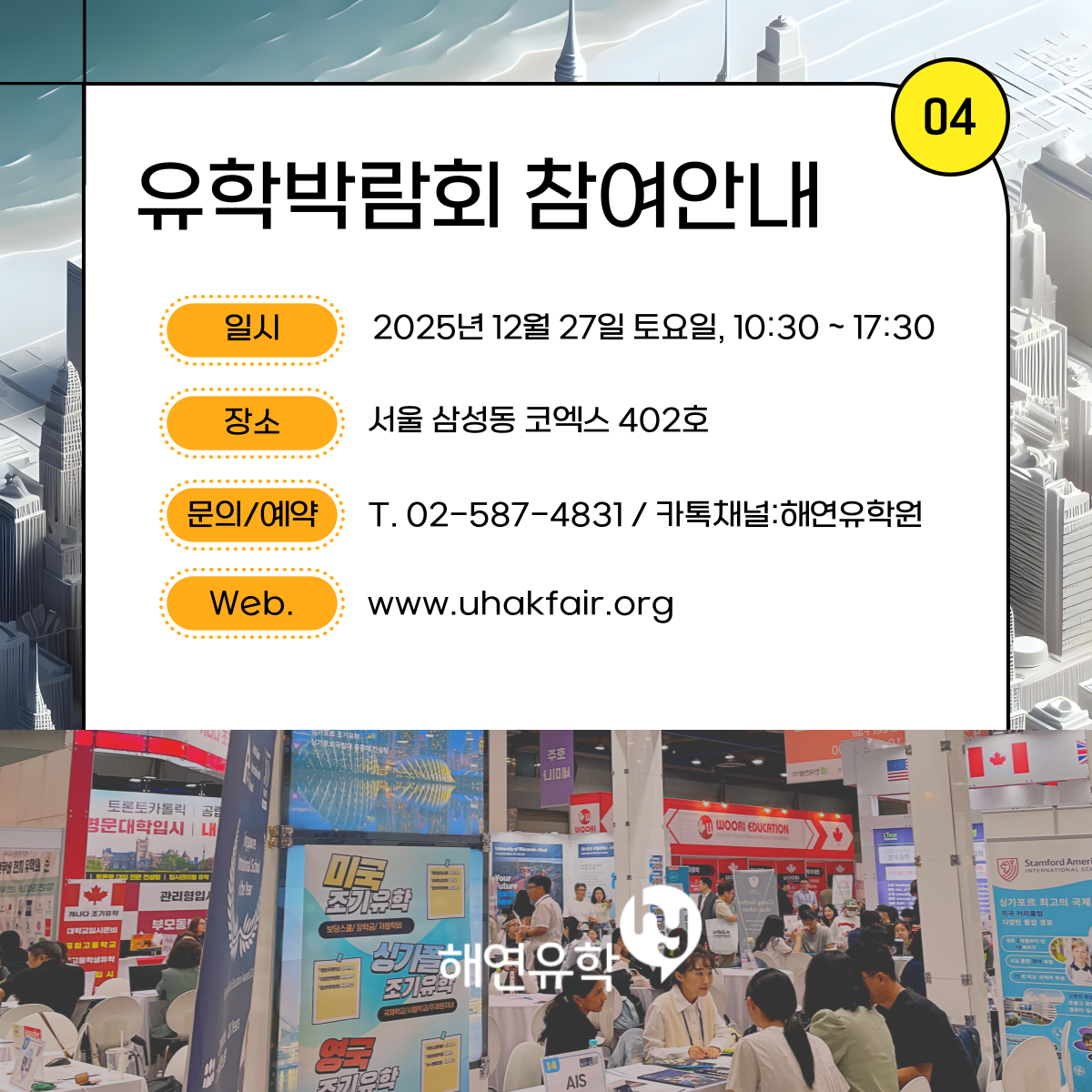 그리고! 오는 12월에는 저희 해연유학원에서 박람회가 개최됩니다. 이번 박람회에서도 미국보딩스쿨 상담도 직접 받아보실 수 있으니 많은 관심과 참여 부탁드립니다. 미국 외의 다른 국가 유학을 고려 중이신 분들도 박람회에서 함께 상담이 가능하오니, 편하게 찾아주세요~^^