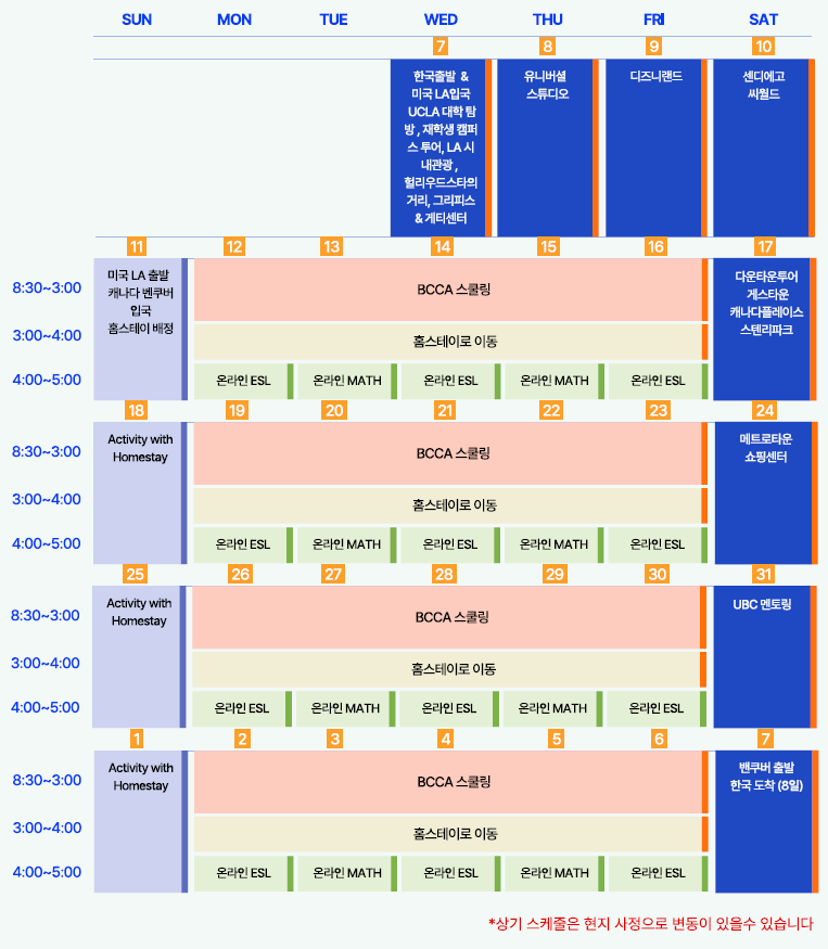 | 포함 내역 | 미서부 여행(호텔, 모든 관광지 입장료 등), 홈스테이, 방과후 온라인 수업, 주말 액티비티, 교재 프린트물 |