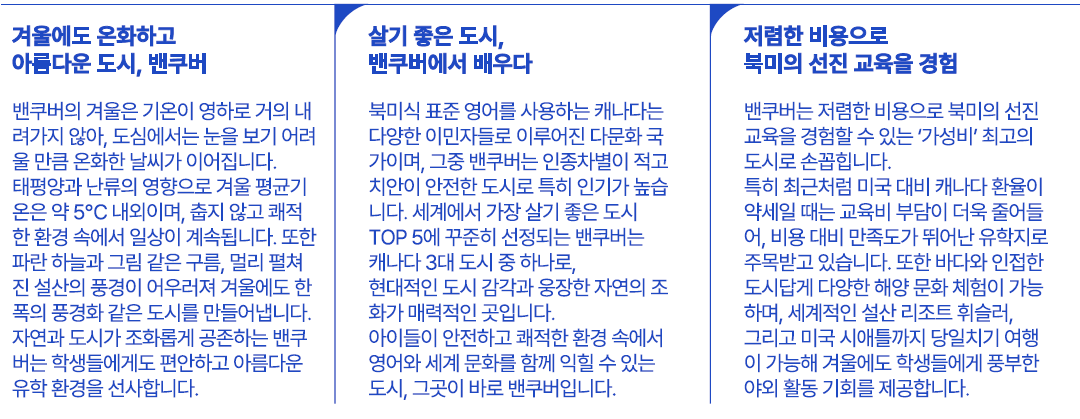캐나다는 상당히 안전한 국가로 알려져 있으며, 겨울 시즌에도 많이 춥지 않은 날씨를 가지고 있습니다. 벤쿠버 지역은 한국에서 직항 비행기도 많고 실제로 한국 교포들이 많은 곳이기도 합니다. 비행기로 10-11시 시간 정도로 다른 지역에 비해서 가까운 거리이며, 영어 발음도 표준 발음에 가깝습니다. 벤쿠버 지역은 외국인에 대해서 열린 마음을 가지고 있다는 점도 장점 중에 하나입니다.