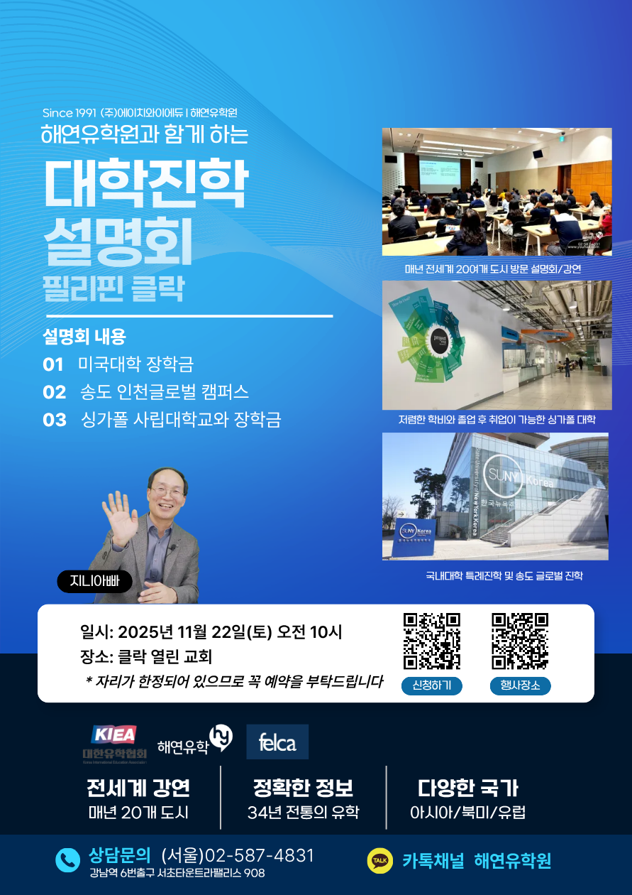 필리핀 클락 현지방문 대학진학설명회-송도글로벌/미국대학장학금/싱가폴대학