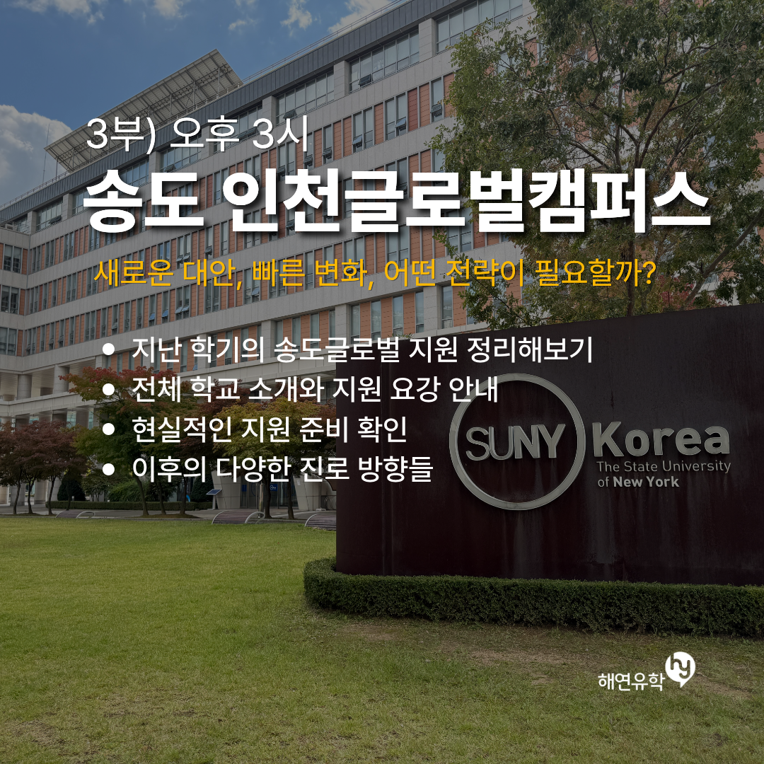 - 내용: 2026년 봄학기 입시 결과 및 최신 트랜드 분석, 인천글로벌캠퍼스 지원을 위한 입시 요강 안내와 지원에 관한 팁 정리. 송도에 위치한 해외 대학교인 스토니브룩대학교(뉴욕주립대), FIT(뉴욕주립대), 조지메이슨대학교, 겐트대학교, 유타 대학교 등에 설명과 과연 어떤 형태의 대학인지도 알려드립니다.